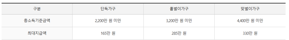 - 단독가구: 연 소득 2,200만 원 미만, 최대 165만 원