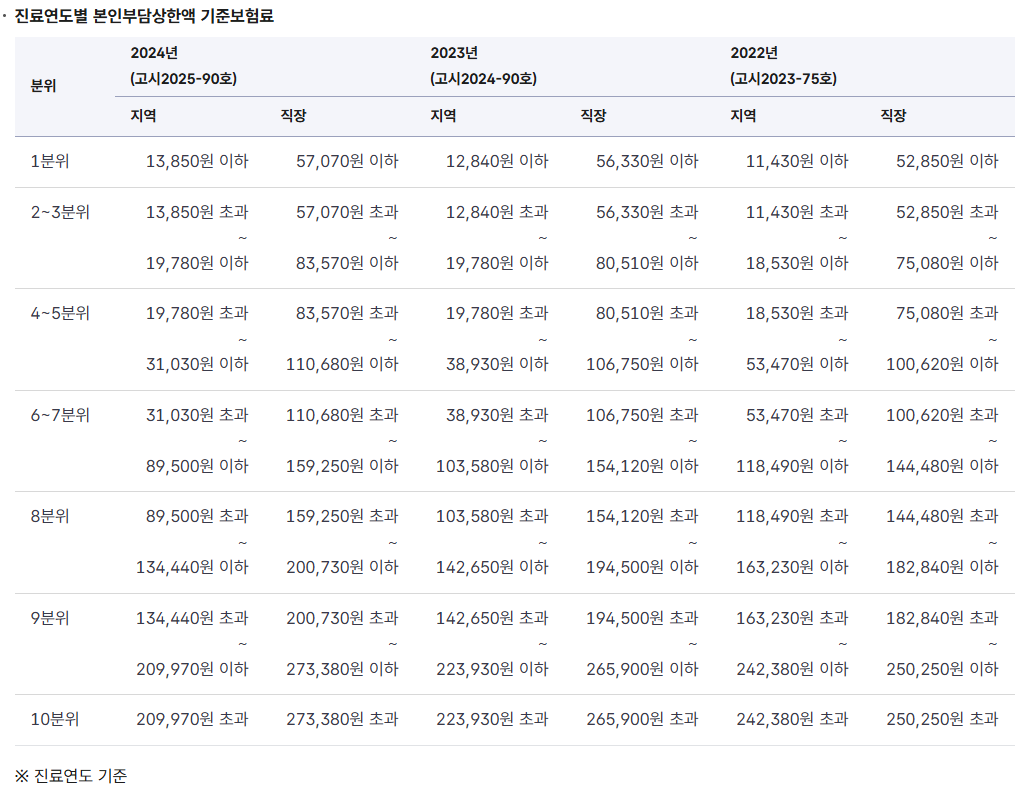 - 소득분위는 가구의 소득 수준을 구간화한 값입니다. 이 구간에 따라 연간 본인부담상한액(개인별 상한금액)이 달라집니다.