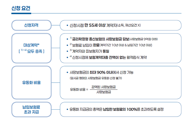 금융위원회와 주요 생명보험사들이 TF를 꾸려 준비한 제도인데요. 쉽게 말해, 종신보험에 가입했더라도 나중에 가족에게만 전달되는 돈을, 55세 이상이 되면 일정 부분 당겨서 내 노후 생활비로 전환할 수 있게 한 것입니다.