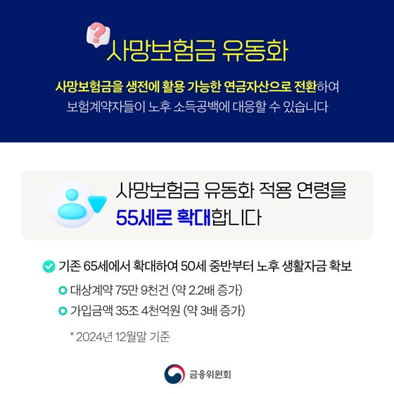 - 사망보험금 유동화, 5개 보험사부터 ‘25.10월 출시 - 은퇴시점-연금수령 개시시점 사이 소득공백에 대응할 수 있도록 55세부터 연금(+서비스)수령 가능(75.9만건, 35.4조원 대상) 금융위원회는