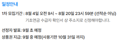 1차 신청은 8월 4일(월)부터 8월 13일(수)까지 진행되며, 선정 결과는 8월 말 개별 안내될 예정입니다. 1차로 배정된 상품권은 9월부터 사용할 수 있고, 사용 기한은 10월 31일(금)까지입니다. 접수 상황에 따라 10월 중 추가 접수도 계획되어 있으니, 1차를 놓쳤다면 전용 누리집 공지 알림을 켜 두고 재도전하면 좋습니다.