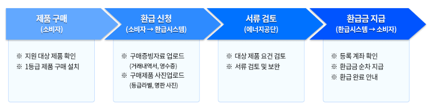 - 환급절차: 제품구매 → 환급신청 → 서류검토 → 환급금 지급
