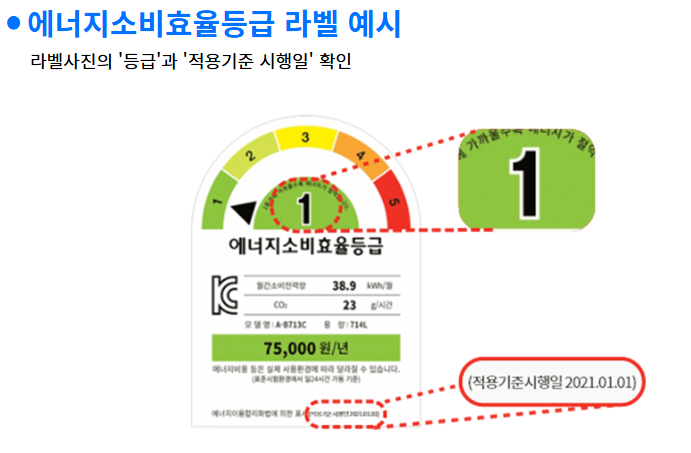 - 제품의 에너지효율 등급 라벨 ‘등급’과 ‘적용기준 시행일’을 실제 라벨에서 확인하세요. (판매 페이지 표기와 차이 있을 수 있음)