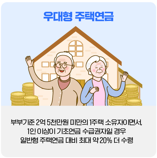 기초연금 수급자이면서 부부 기준 2.5억원 미만 1주택 소유자에게 적용되는 특별 혜택 방식으로, 일반 종신방식보다 최대 20% 더 많은 월지급금을 받을 수 있습니다.